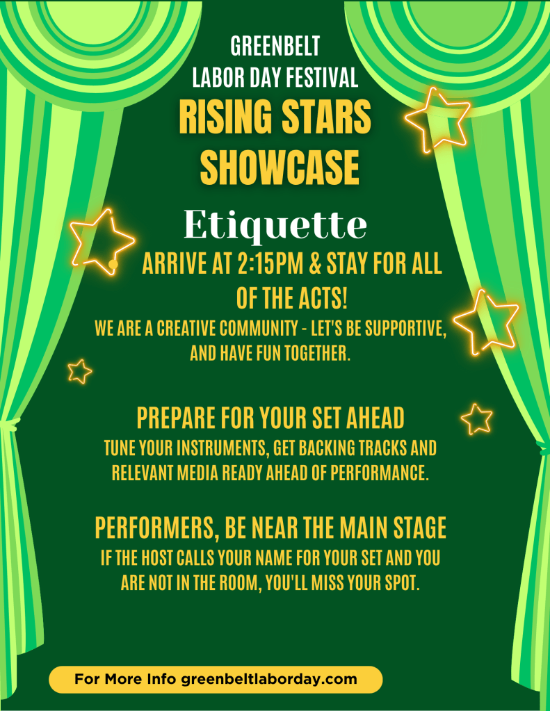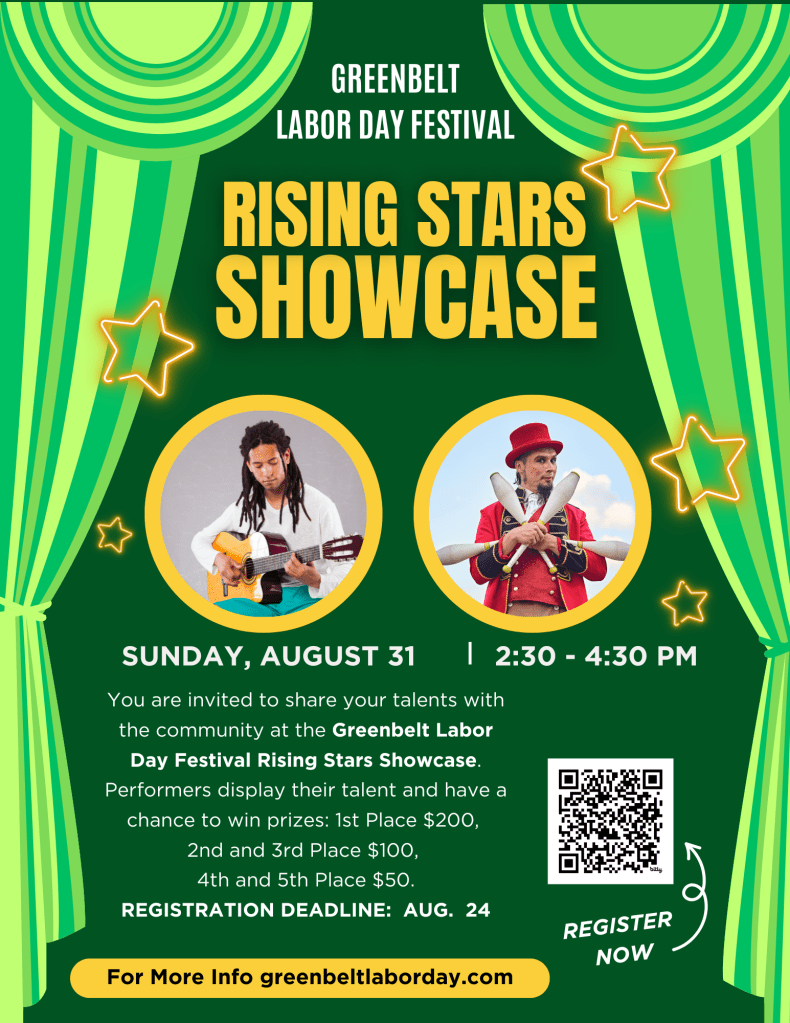 You are invited to share your talents with the community at the Greenbelt Labor Day Festival Rising Stars Showcase on Sunday, August 31 at 2:30 pm. Performers display their talent and have a chance to win prizes: 1st Place $200, 2nd and 3rd Place $100, 4th and 5th Place $50. REGISTRATION DEADLINE: AUG. 24