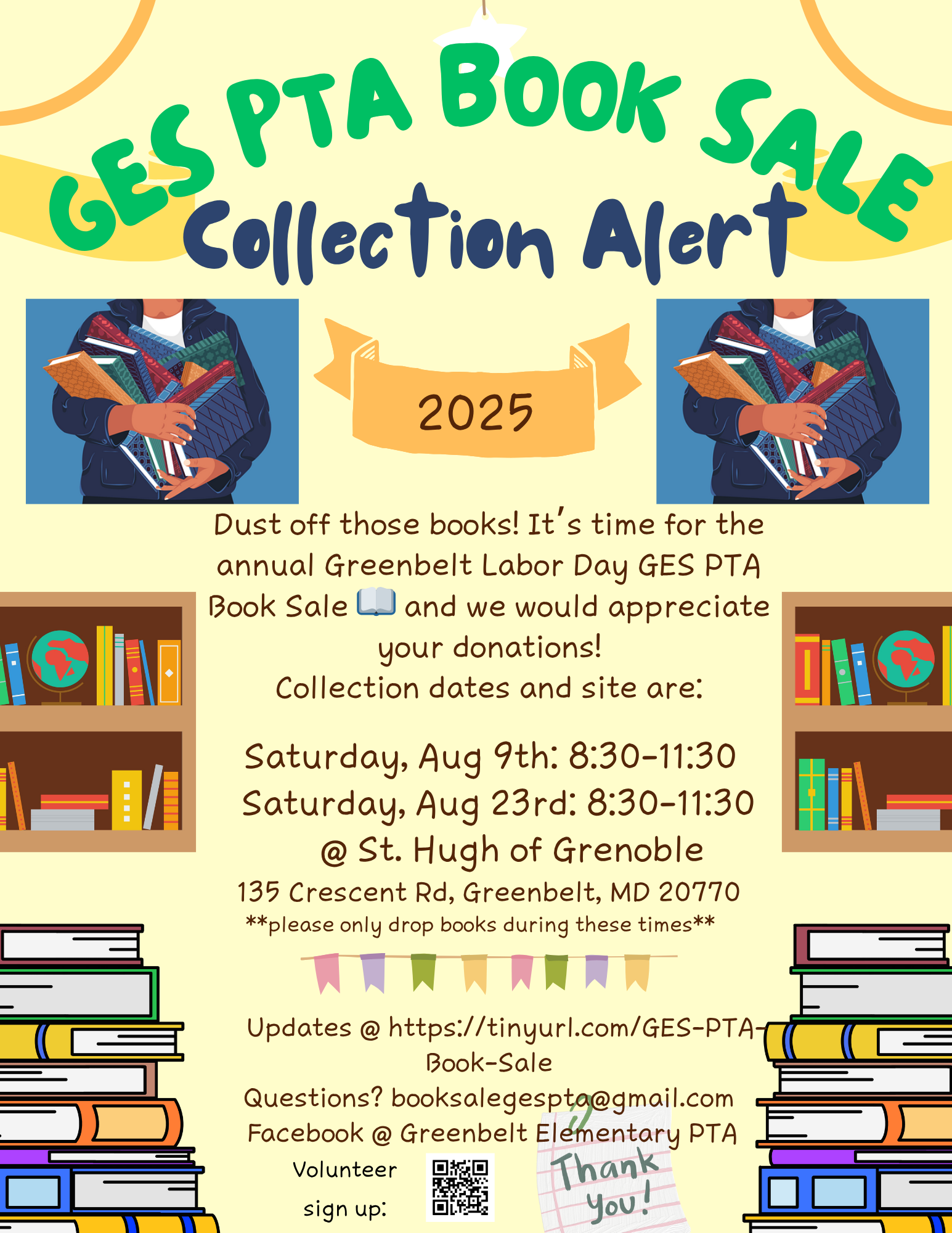 If anyone would like to donate books, they will collect books at St. Hugh of Grenoble Church at 135 Crescent Rd, Greenbelt, on Saturday, August 9 and Saturday, August 23 from 8:30 AM to 11:30 AM. They also accept board games, puzzles, DVDs, CDs, vinyl, and video games at the collection points.