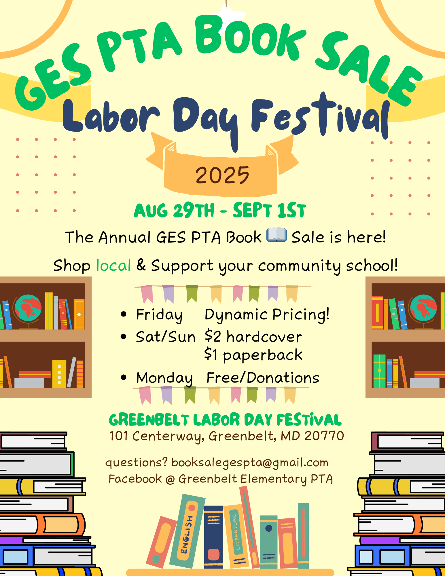 The Greenbelt Elementary PTA runs a used book sale annually as part of the Greenbelt Labor Day Festival. There are thousands of books for sale, all donated during August by community members.